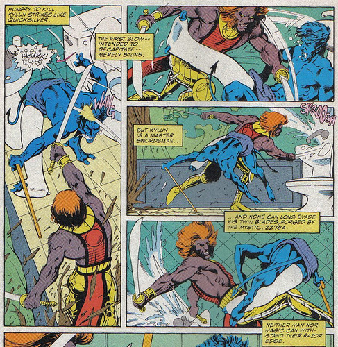 Nightcrawler (a.k.a. Kurt Wagner) is my favorite X-Man. The way he was originally written–a Bavarian circus performer, Nightcrawler idolizes Errol Flynn and is devilish looking but charming and good natured–there is plenty to like. More about this later as his recent characterization in the comics sucks… But, more than just how they used to write him, the way Alan Davis drew him, sucked me in. My obsession really flowered around the time that Alan Davis was writing and drawing Excalibur and this was when Nightcrawler made such a lasting impression on me…