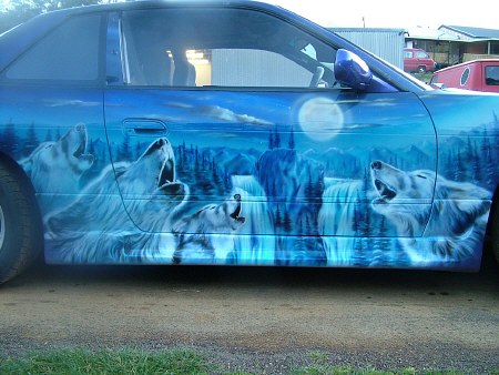 Wolves also act as the muse for many an automobile art enthusiast. If you see an airbrushed van, chances are there’s gonna be a wolf somewhere on that metallic mural. This pic below is from a sports car and not a van…but you get the gist.
