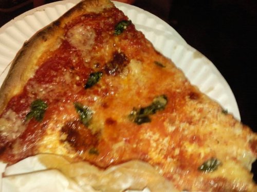 C.) Novelty slices–I can think of a couple of establishments in the city that dare to be different. Two Boots cooks up pizzas influenced by ‘two boot’ destinations–boot-shaped Louisiana and boot-shaped Italy. It’s hits the Cajun angle fairly well and has fun specialty pies that are all named after films/movie characters. (The Mr. Pink has chicken on it, I believe). Two Boots. Another angle that seems to be cropping up a bit more is the ‘Pizza Truck’. NYC has some of the best mobile food vendors in the world. It’s not all just stale pretzels and lukewarm hot dogs. If you ever walk by a food cart in the city and notice a long line, it’s worth hopping into the queue. I grabbed a slice of pizza from this particular vehicle when I was visiting my friend Nikki down by Wall Street. It was surprisingly awesome. It was saucey, with a sharp parmesan finish. Delish: Grandma\’s Pizza Truck